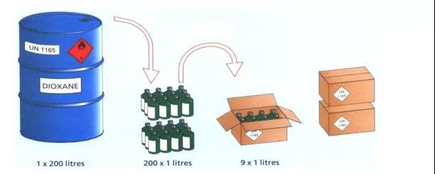 危险货物采用有限数量包装直观地说就是运输某一危险货物时,在采用包装方面,用许多小桶、小瓶替代大包件,然后将这些小包件置于一结实的外包装内,并在外包装内添加吸收剂材料,降低潜在危害或危险性,如下图所示: