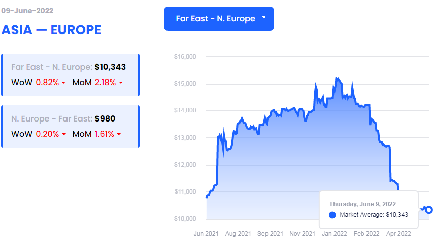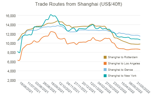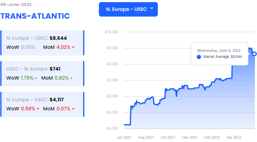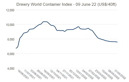 ●德鲁里世界集装箱指数综合指数下降0.6%至每40英尺集装箱7,578.65美元,但比2021年同期高出13%。上海-洛杉矶和上海-纽约的运费分别下降1%至每FEU8,613美元和10,722美元。上海-热那亚的现货运价下跌2%或191美元至每40英尺箱11,485美元。同样,鹿特丹-纽约的运费暴跌1%或86美元至每40英尺集装箱7,100美元。然而,上海-鹿特丹和鹿特丹-上海的运费分别上涨1%至每FEU9,799美元和1,431美元。洛杉矶-上海和纽约-鹿特丹的价格在前几周的水平附近徘徊。德鲁里预计未来几周该指数将缓慢下降。