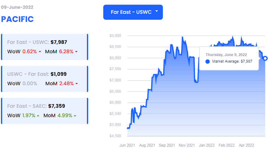 ●德鲁里今年迄今评估的WCI平均综合指数为每40英尺集装箱8,569美元,比五年平均每40英尺集装箱3,423美元高出5,146美元。