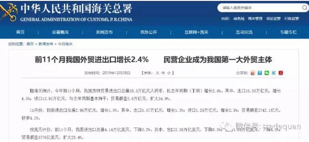 按美元计价,前11个月,我国进出口总值4.14万亿美元,下降2.2%。其中,出口2.26万亿美元,下降0.3%;进口1.88万亿美元,下降4.5%;贸易顺差3776亿美元,扩大28.4%。