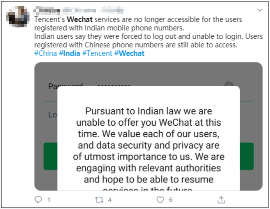 目前已有大量印度用户在推特反应这一情况,他们表示,打开微信后,自己的微信账号被强制登出,然后就再也无法登陆,即便使用VPN登录也不行。