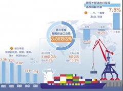 前三季度,我国货物贸易进出口总值23.12万亿元人民币,比去年同期增长 0.7%,累计增速实现转正。 其中,第三季度进出口总值、出口总值、进口总值分别为8.88万亿元、5万亿元、3.88万亿元,均